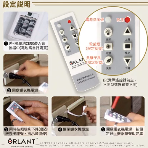 別擔心歐蘭特電動曬衣機專用遙控器上架啦!只要選擇對應機型的遙控器,在家中就可以簡單的自行設定囉!